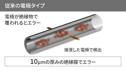 従来の電極式は、電極が絶縁性付着物に覆われると検出できませんでしたが、“完全貫通構造”のFD-Mシリーズは元々電気を通さない通水部の外から検出しているので、絶縁物が付着しても検出可能です。