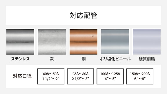 超音波を伝達する材質であればどのような配管材質でも検出可能。また、対応口径の範囲であればどのような大きさの配管でも取り付けできます。