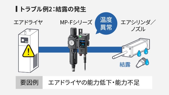 エアによるトラブルの例として、「圧力低下」と「結露の発生」があります。