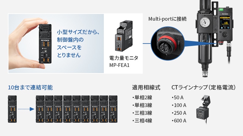 MP-Fシリーズは、電力量モニタMP-FEA1と接続すると装置の電気使用量を同時にデータ収集することが可能。