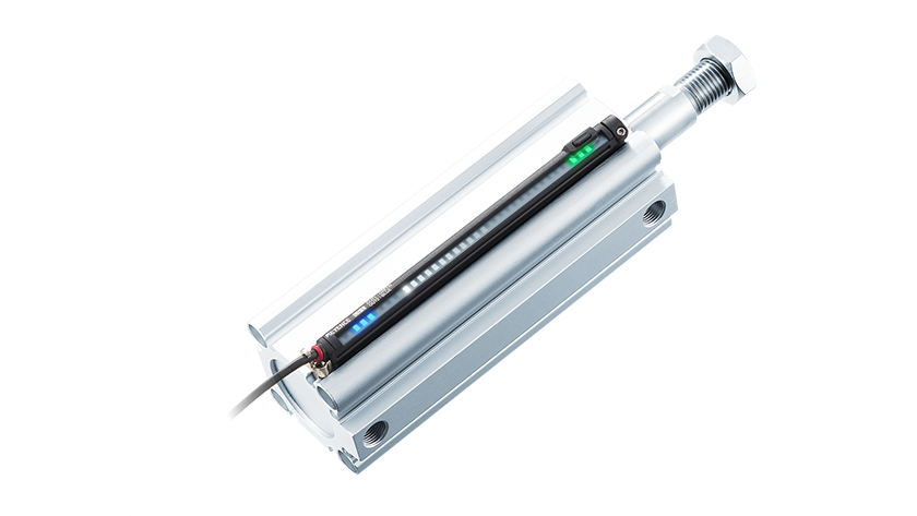 直線上に並べられた検出素子が、シリンダ内のピストンマグネットを検出し、0.1 mmの分解能で位置を判別します。
