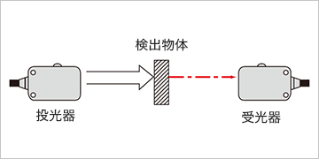 透過型は、投光器と受光器を対向して設置。その間をワークが通過して光をしゃ断した際の、受光器が受ける光量の減少により検出します。検出距離が数cm~数十mと長く、ワークの通過位置が変わっても高い精度で検出できます。レンズの汚れ、ゴミに強いため動作の安定度が高く、不透明体であればワークの反射率や色・材質に関係なく検出できます。