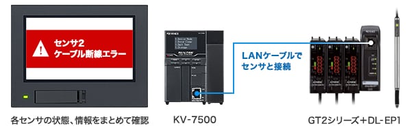 設置されている複数センサの現在値や、OK/NGなどの状態をリアルタイムで監視し、異常が発生した際、瞬時に確認可能です。また、予知保全用のデータをあらかじめ設定しておくことで、故障の前兆を検知でき、運用の効率化が可能となります。