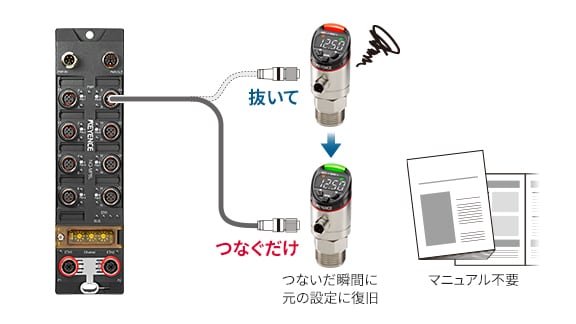 センサ個別の設定や各種パラメータをNQシリーズ本体でバックアップしているため、センサが壊れたときも新しいセンサと交換すれば復旧できます。