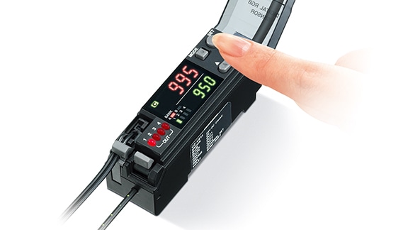 検出したいワークを置いてボタンを1回押すだけで、誰でも簡単に設定できます。 また、現在値と設定値を同時に確認できる「2段デジタルディスプレイ」を搭載しているので、動作状況の確認や微調整も直感的にできます。