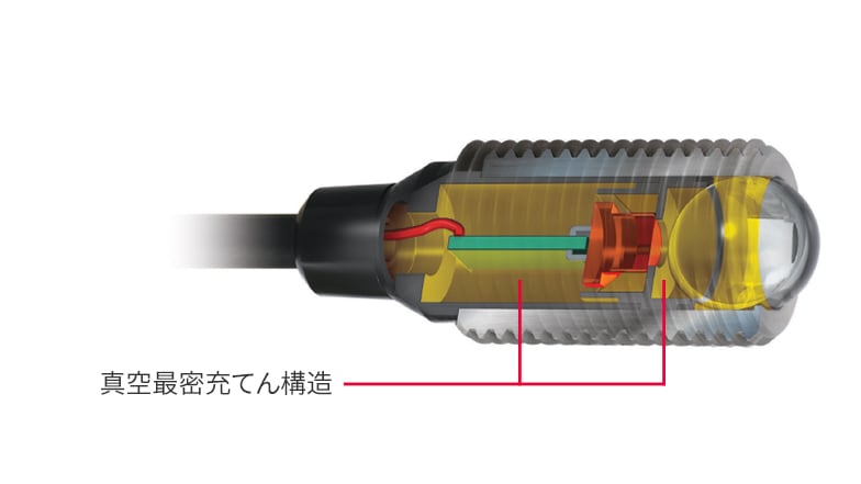 透明のエポキシ樹脂をケースの隅々まで真空充てんすることで、ケーブルやレンズとの密着性を極限まで高めています。パッキンは一切使用しておりません。