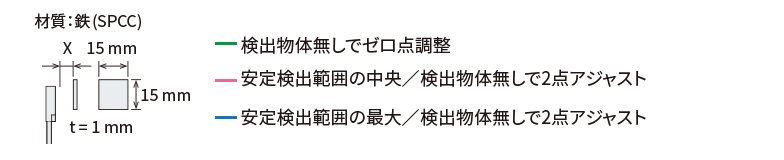 検出物体サイズ:15 mm×15 mm 厚さ t=1 mm(標準検出物体サイズ)ノーマルモード