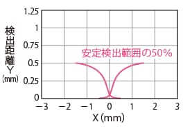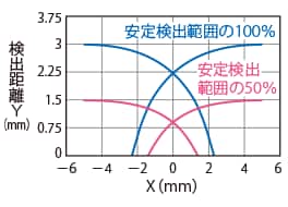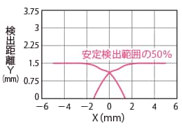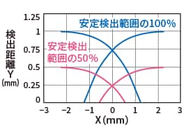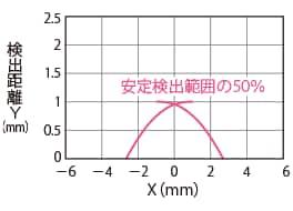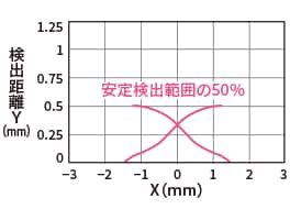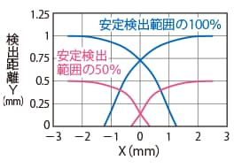 標準検出物体を安定検出範囲の50%に置いたときと、検出物体がないときで2点アジャストをおこない、標準検出物体が安定検出範囲の100%の距離にあるときの表示値を設定値とした場合。動作モードが磁性金属/非磁性金属では検出距離が短くなります。