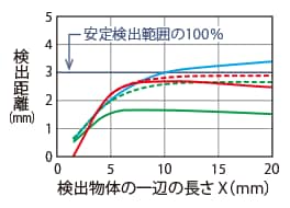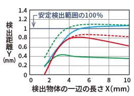 検出物体の大きさと材質による検出距離の変化(代表例)