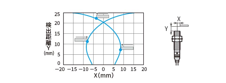 標準検出物体(仕様に規定)をセンサに対して矢印の方向に平行移動させたときの、ON点の位置を表したものです。