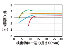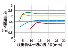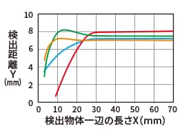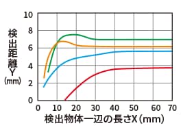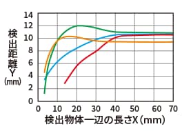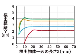 検出距離は、検出物体の材質、大きさ、厚さによって変化します。