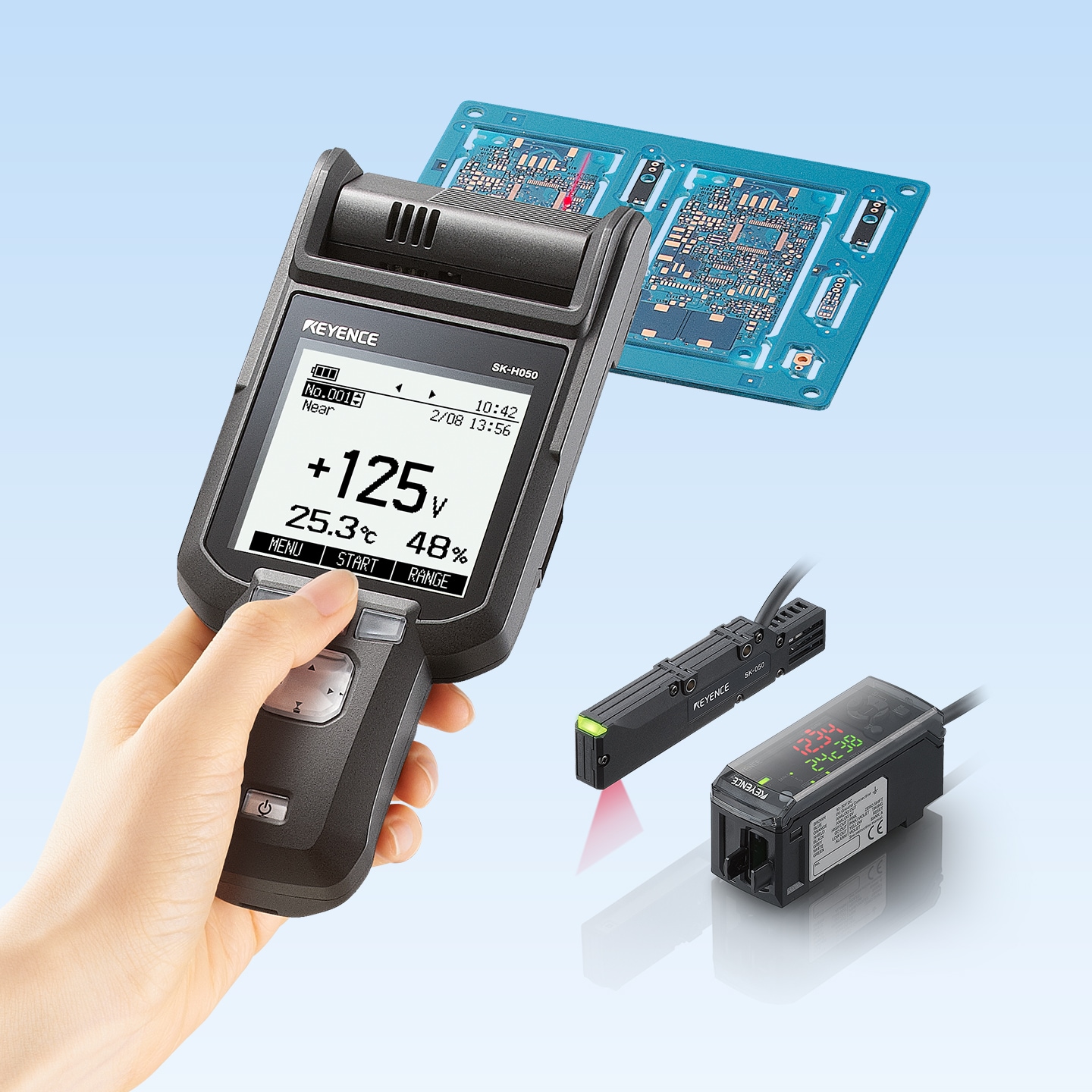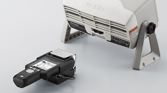 センサヘッドSK-300をイオナイザの前後に設置し、ワークや環境ごとに変わる除電効果を時系列でPCへ保存。