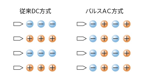 電極針に「+」「-」の高電圧を交互に印加し、両方の極性のイオンを生成させるパルスAC方式を採用。