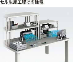 設置スペースの少ないセルブースでのご使用でもスペースを取らずに広範囲除電を行なうことができます。