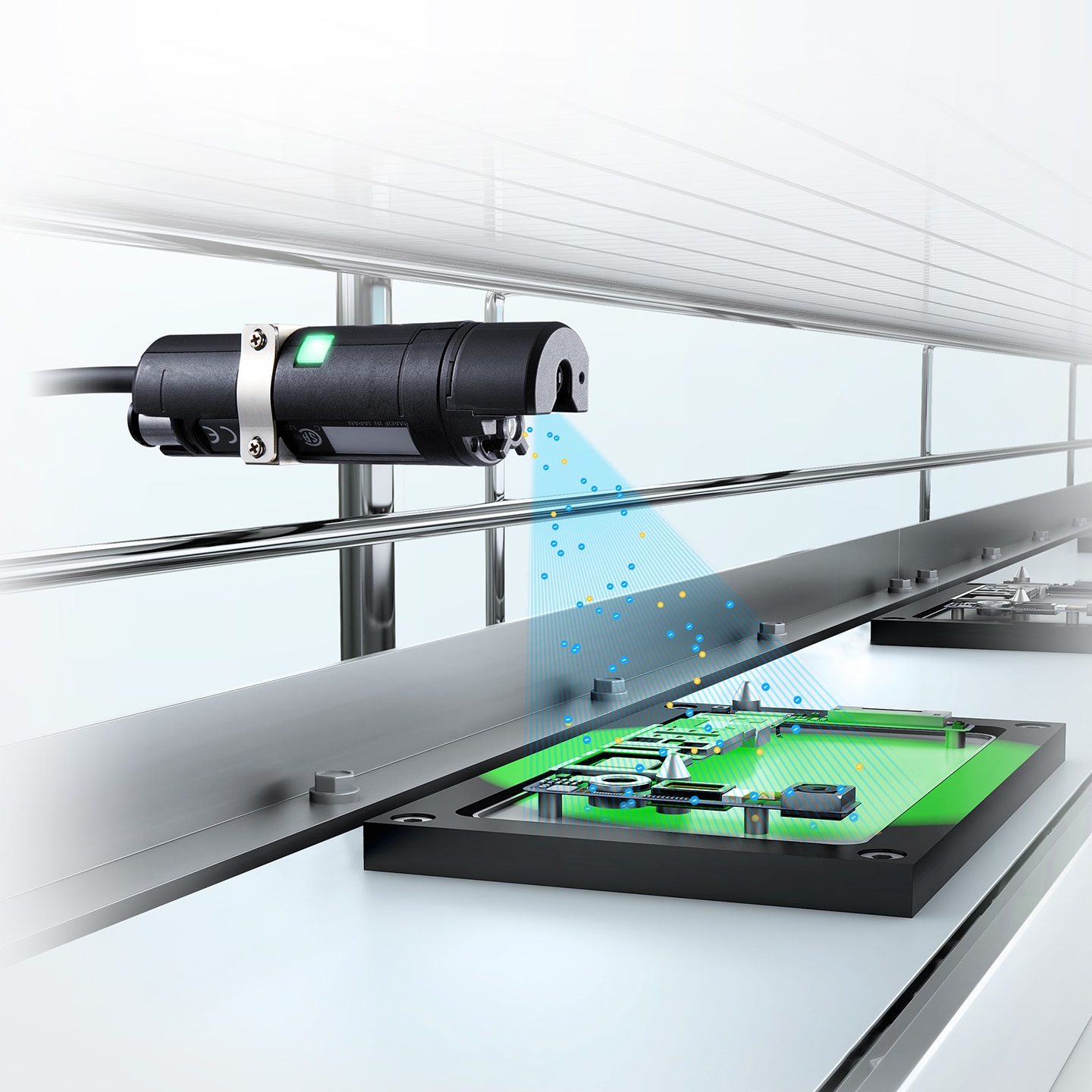 対象物の帯電状況を色でお知らせ。正しく除電されているかがどの角度からでも一目でわかるため、立ち上げ時や動作中の効果確認が簡単におこなえます。