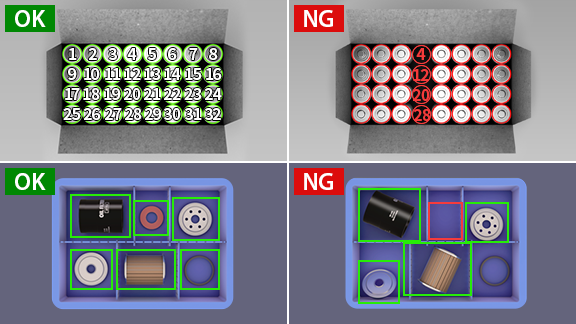 対象物の特徴をさまざまな観点から(形状・色・明るさ・エッジなど)抽出し学習します。また「通過モード」では、インラインで通過する対象物の数量をカウントすることが可能です。