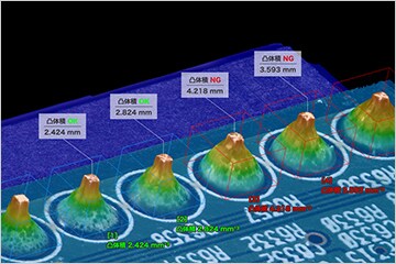 3次元画像処理システムは、高機能なプロジェクター一体型の3Dカメラ(XTカメラ)で構成する、次世代型の画像処理システムです。ライン上で最大60.2×60.2mmの測定エリア内全域の3Dおよび2D外観検査や実寸での3次元寸法計測など、複数の高度な検査項目の一括実施が可能です。繰り返し精度1μm・検査間隔0.6秒を実現し、高精度で高速なインライン検査を安定して行うことができます。XTカメラは、4投光RGBプロジェクターや大口径テレセントリックレンズ、944万画素CMOS撮像素子を搭載し、3D検査に適した撮像とヘッド内並列処理による高速化を実現。また、多彩な検査アルゴリズムやツールを使って高度な検査項目も簡単に設定可能です。1台で検査精度とタクトタイムの飛躍的な向上が実現します。