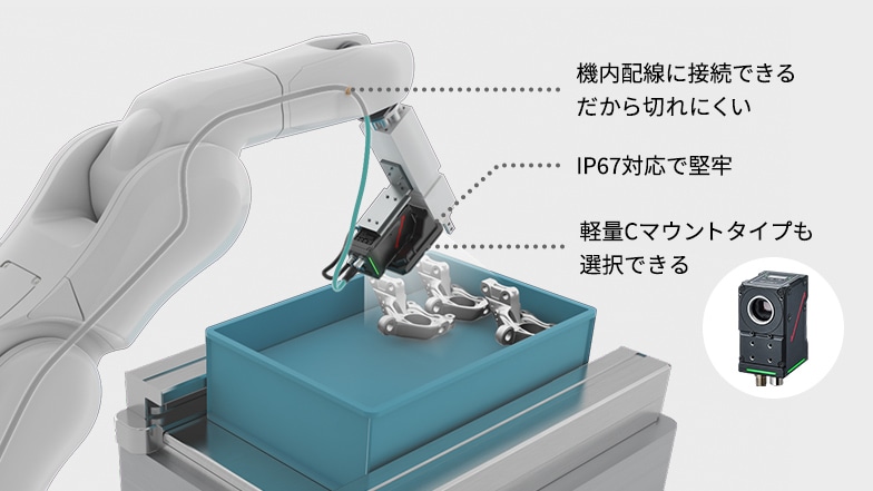 PoE接続による機内配線、IP67の耐環境性、Cマウントタイプでの軽量化を活かして、オンハンドアプリケーションにも適応範囲が広がります。