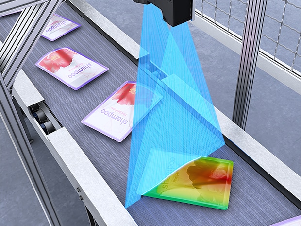 アルミパウチされた商品の箱詰め工程では、パウチの姿勢をロボットにフィードバックすることが必要です。3次元情報を使えば平面ではわからない高さの違いからワークの姿勢を認識することができます。