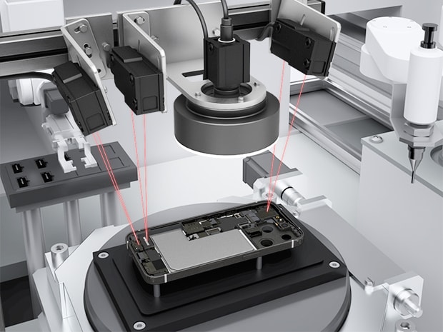 スマートフォンの筐体に組み付けられた部品の位置や高さを検査します。複数の変位センサや、カメラなどを組み合わせておこなう検査も、LJ-S8000シリーズなら1台で対応可能。従来複数の検査手法にまたがっていた検査内容を省スペースで実現します。