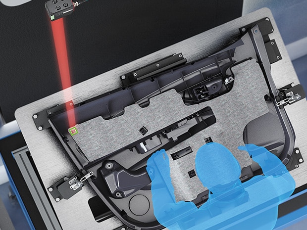 自動車部品などの複雑な組立工程において、作業者の生産性を維持しながら、個々の部品のトレーサビリティを確保することは重要な課題です。この画像は、キーエンスの1D/2Dコードリーダ「SR-2000シリーズ」を活用し、その課題を解決するアプリケーション事例です。