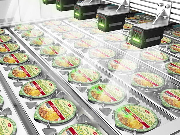 この画像は、多列で搬送されるカップ麺の蓋に印字されたコードを、FA(ファクトリーオートメーション)システムに組み込まれた画像処理技術で一括読み取りするアプリケーションです。ここで活躍するのが、キーエンスの移動体・ラベル用コードリーダ「SR-Lシリーズ」です。1台で広範囲をカバーできる超広視野が最大の特徴で、これまで複数台のコードリーダーや複雑な機構が必要だった多列ワークの読み取りをシンプルに実現します。これにより、装置の導入コストと設置工数を大幅に削減できます。また、高速な生産ラインでも安定した読み取り性能を発揮し、確実な品質管理と生産性向上に貢献します。内蔵照明やオートフォーカス機能により、品種替えに伴う設定変更も簡単で、ダウンタイムを最小限に抑えることが可能です。包装工程におけるトレーサビリティ管理の効率化とコストダウンを両立するソリューションです。