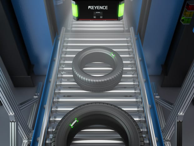 キーエンスの物流コードリーダ「SR-5000シリーズ」は、このような課題を解決します。圧倒的な読み取り範囲と深い被写界深度により、コンベア上を流れるタイヤのサイズが変わり、リーダーとの距離が変動しても、事前の品種切り替えや面倒な設定変更は一切不要です。高速で搬送されるタイヤの側面に印字されたDataMatrixやQRコードを、瞬時にかつ安定して読み取ります。