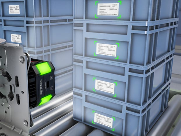 物流倉庫や工場のコンベアラインで、段積みされた通い箱やコンテナのバーコードを一つずつ読み取る作業は、時間と手間がかかり生産性のボトルネックになりがちです。このアプリケーションは、高速で搬送される段積みコンテナの側面に貼られた複数のバーコードや2次元コードを、1台のコードリーダで一括で読み取ることで、物流プロセスの劇的な効率化を実現します。