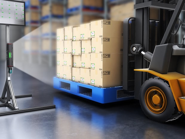 物流倉庫や製造現場における、フォークリフトでの入出荷検品や棚入れ作業。パレットに積載された多数の段ボール箱のバーコードを、ハンディターミナルで一つひとつ読み取る作業は、多くの工数を要し、ヒューマンエラーの原因にもなります。