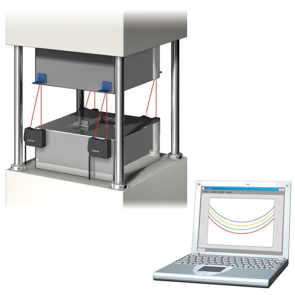 プレスのストローク挙動によっては絞り成型がうまくいかず亀裂を生じさせる恐れがあります。ロングレンジのレーザ変位計を用いることで条件出しの時間を短縮することが可能となりました。