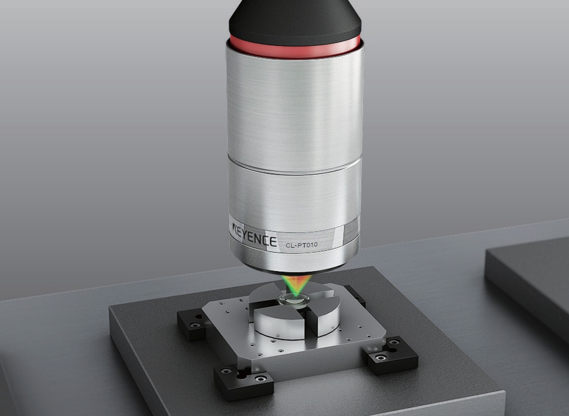 小型レンズの表面形状を測定し、曲率を算出します。同軸マルチカラー共焦点方式のCLシリーズは、照射光の開口が広角で、反射光の一部を受光できれば検出が可能なため、透明対象物の曲面も高精度に測定できます。