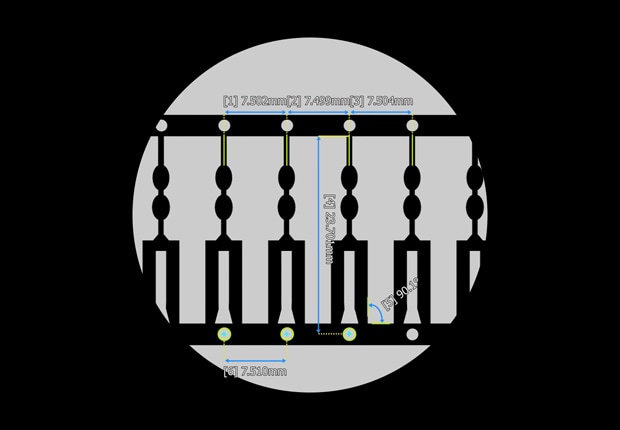 打ち抜き直後の端子部品の寸法測定をすることで、プレスで異常があった際にも、発生直後に発見することが可能となります。校正の取れた測定器であるため、測定値の保証も可能です。
