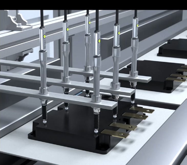 各部品実装後の高さが規定値に入っていないとモールド成形した際に不良が発生する。平面切削で平行度を出すが、ミクロン単位で平行度を検査する。GT2シリーズを使用すれば、精度1 μm、分解能0.1 μmの高精度測定が可能。また、ø8のペンシルタイプのプローブのため、狭い範囲に複数の取り付けが可能。