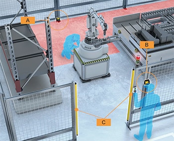 - エリアセンサやライトカーテンなどを設置し、人を感知して動作を停止するようにする。