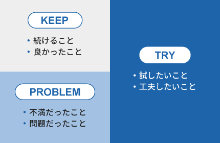 KPT法は、Keep・Problem・Tryの3要素のみで構成されているためシンプルで使いやすいフレームワークです。