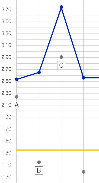 A:上方管理限界線(UCL)B:下方管理限界線(LCL)C:管理限界線の幅