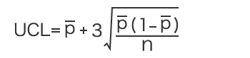 p管理図の上方管理限界線(UCL)と下方管理限界線(LCL)は、右の式で算出しました。この中で、「」は不適合品の割り合い「(1-)」は適合品の割り合いです。