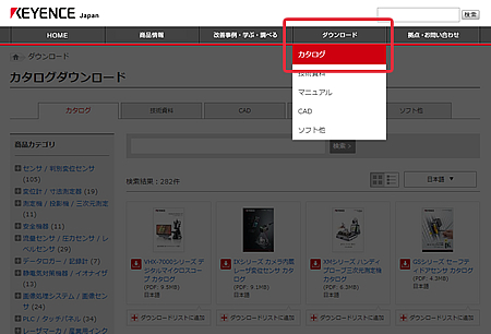 グローバルメニューの「ダウンロード」のプルダウンメニューから「カタログ」をクリックするとカタログのダウンロードページに遷移します。ご希望のカタログをダウンロードしてください。
