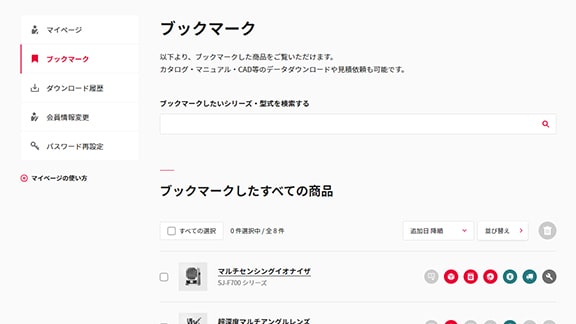 「ブックマーク」ページから、カタログ・マニュアル・CAD等のデータダウンロードや見積依頼も可能です。