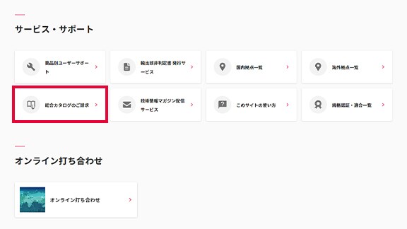また、トップページ下部にある、サービス・サポートの「総合カタログのご請求」ボタンからもお進みいただけます。