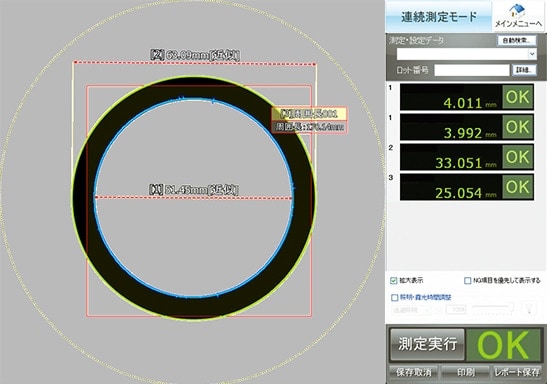 ノギスでは、接触させるとOリングがゆがんでしまい、測定誤差が発生していた。 また、Oリングがゆがんだ形で測定してしまうと、測るポイントによる数値がかわってしまい正確な測定ができません。