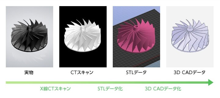 測定データはCADデータとして出力可能なので、リバースエンジニアリングが盛んな業界を中心に幅広く活用されています。測定の時間や精度、図面化の手間を省ける