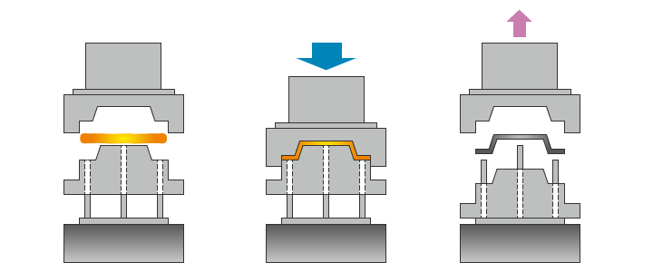 プレス成形とは、プレス機の上下に金型と呼ばれる工具を取り付け、その間に材料(被加工材)を入れ、圧力を加えることで目的の形状にする加工方法です。プレス成形は、惰性加工の一種です。また、プレス成形によるプロセスを「プレス金型工程」と呼びます。プレス加工は、切る・曲げる・成形するといった加工を行いますが、その際に必ずスプリングバックが発生します。