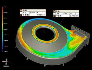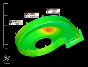 プレス品を無理に固定するとありのままの形状を正しく測定できませんでしたが、VLシリーズなら非接触でスキャンしたデータをCADと比較可能。最適な金型寸法を簡単に把握でき、スプリングバック問題を解決できます。また、曲面形状を持つワークでも非接触で正確な3Dデータを取得可能です。非接触で数百万点の形状データを取得するので、複雑な形状のワーク全体の形状を把握できます。