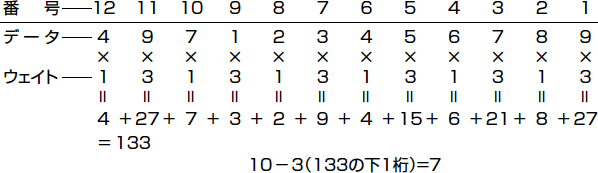 - ③その数の総和を求め、下1桁の数を10から引いて出た数がチェックデジットです。