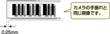 このLEDの点灯時間が1ms(1/1000秒)であったとします。1msの間にバーコードのナローバー幅分、例えば0.25mm移動してしまうと、下図のように画像が重なりあってしまい、読み取れなくなります。