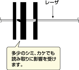 ただし、CCDバーコードリーダの受光軸の太さは1mm弱であり、レーザ式バーコードリーダのスポット径(0.2mm)の約5倍程度あるため、シミやカケがあってもそれを平均化して読み取ることができます。