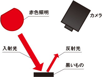 反対に黒色は、すべての色を吸収する(光を反射しない)特長を持っています。そのため、赤色照明から発せられた光は黒いものに当たると、吸収され、ほとんど反射がおきません。