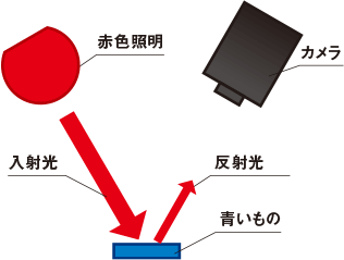 赤色は、赤色を反射させる特長を持っています。したがって、赤色照明から発せられた光は赤いものにあたり反射します。