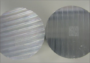 切削面、加工面を研磨していない場合、その加工痕が残った状態となります。上図のように円柱ワークの切断面に2次元コードを印字すると、その切断方向に加工痕が残るため、その加工痕方向に照明光が伸びるような状態(下図)となります。